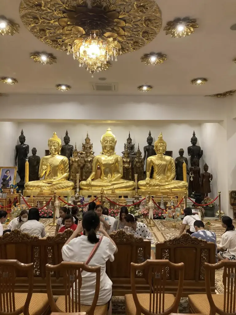 この日の夜、仏教徒はお花とお線香とろうそくを持って、説法を聴きながら、お寺の本堂を時計回りに3周します。この儀式はウィエンティエンเวิยนดทียนと呼ばれ(タイ語でウィエンは「周る」、ティエンは「ろうそく」)、今回は日本人もたくさん住むエカマイเอกมัยのワット・タートトーン วัดธาตุทองに行ってきました。このお寺はBTSエカマイ駅の目の前にある大きなお寺で、バンコクに住んでいる日本人ならきっと何度も前を通っておられると思います。広い駐車場の前には大きな立像があり、夜にはライトアップされます。境内の本堂と、その後ろにある美しい仏塔では、黄金の仏像を見ることができます。