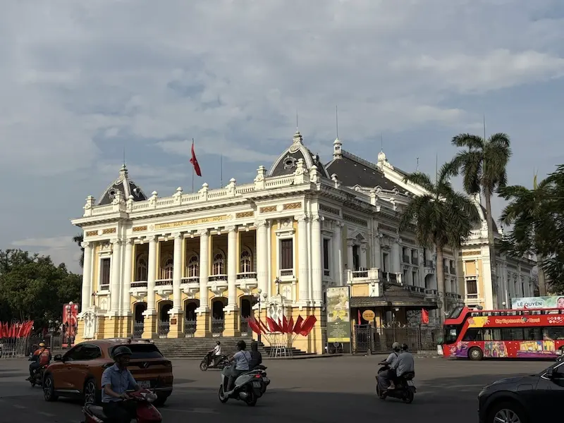 スタート地点はハノイ歌劇場(通称ハノイオペラハウス)。これは、フランス植民地時代1901〜1911年に、10年かけて、パリのオペラ座に倣って建てられたもので、規模はパリの“本物”の半分くらいですが、十分ヨーロッパを感じられます。