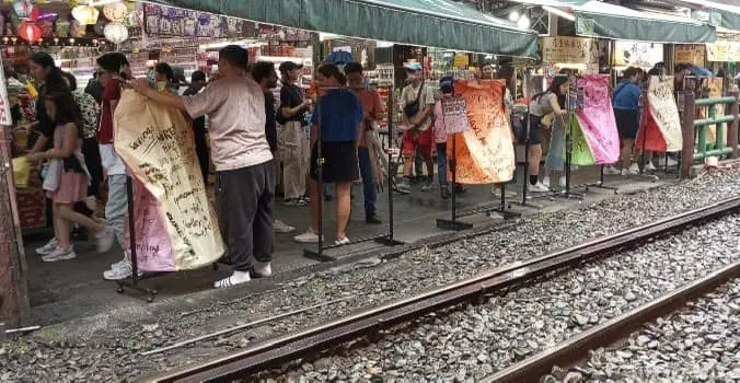 ランタン上げや十分瀑布で有名な十分へは、瑞芳駅から自然豊かなローカル線の平渓線に乗り、十分駅で降ります(片道NT$19)。駅のそばのお店ではお土産物の他ランタンも売っていて、列車が来ない間(ローカル線なので、列車が来るのは1時間に1本くらい)線路上でランタンを上げている観光客がたくさんいました。駅そばの商店街のはずれに十分瀑布方面に行く吊り橋があり、そのそばでもランタン上げができます。因みにランタンは1個NT$250(約1,200円)で売られていました。