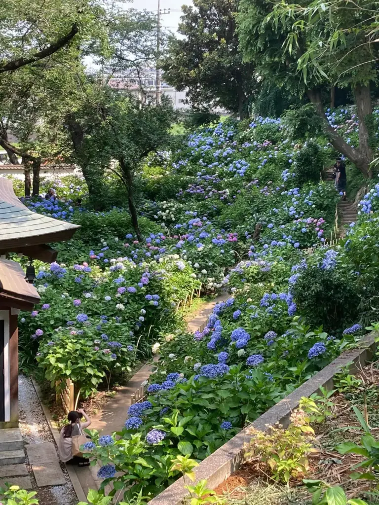 A very famous temple for the flower is in Kamakura but if you don’t like a tourism spot with a crowd of sightseers, a quiet temple in a residential area of Kawasaki may be worth a visit. Myorakuji is a small temple with less visitors but still you can enjoy beautiful Ajisai flowers therein.